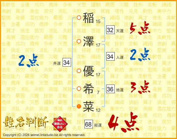 稲(15画)澤(17画) 優(17画)希(7画)菜(12画)