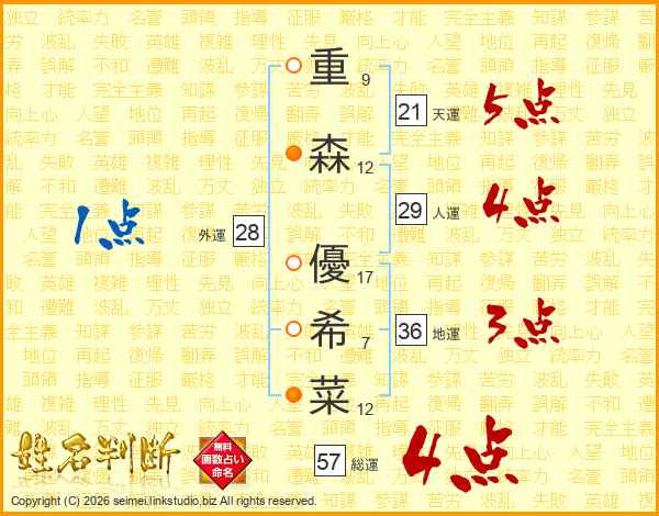 重(9画)森(12画) 優(17画)希(7画)菜(12画)