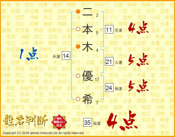 二(2画)本(5画)木(4画) 優(17画)希(7画)