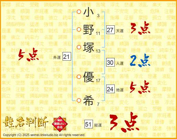 小(3画)野(11画)塚(13画) 優(17画)希(7画)