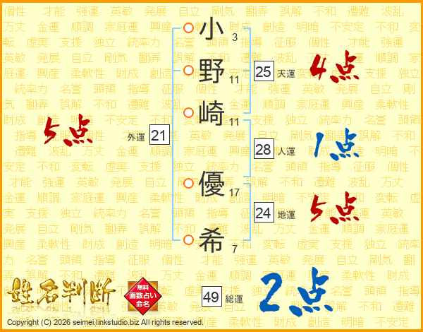 小(3画)野(11画)崎(11画) 優(17画)希(7画)