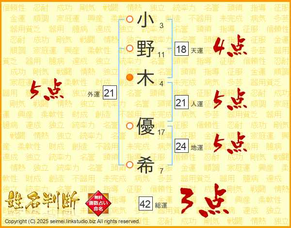 小(3画)野(11画)木(4画) 優(17画)希(7画)