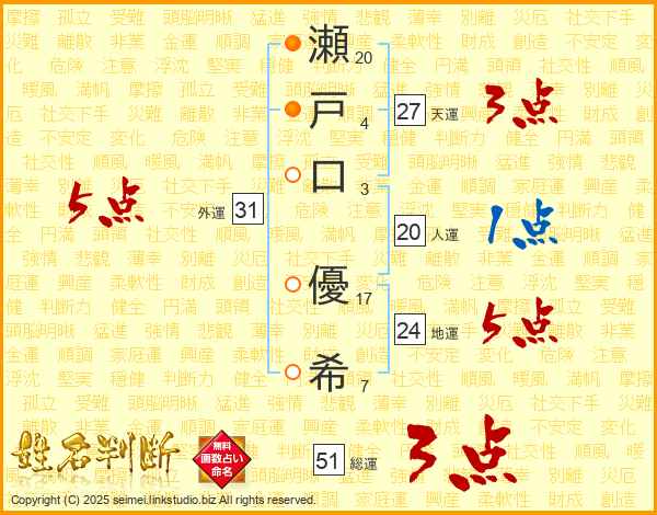 瀬(20画)戸(4画)口(3画) 優(17画)希(7画)