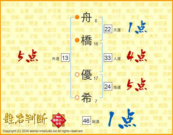 舟(6画)橋(16画) 優(17画)希(7画)