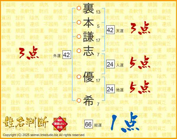 裏(13画)本(5画)謙(17画)志(7画) 優(17画)希(7画)