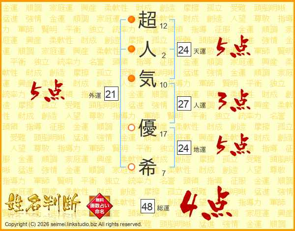超(12画)人(2画)気(10画) 優(17画)希(7画)