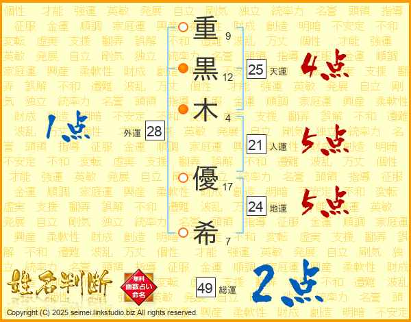 重黒木優希さんの天運は25画の4点!