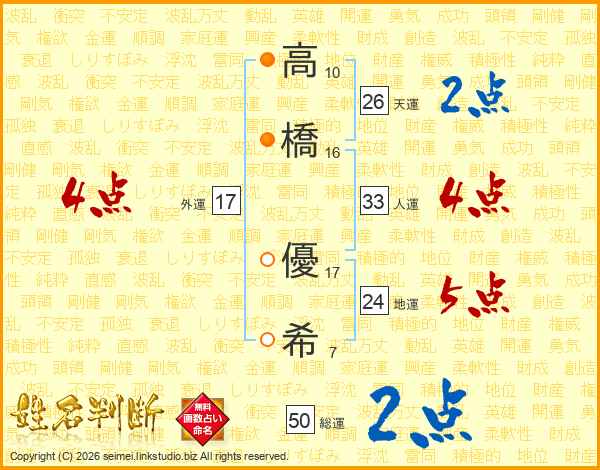 高(10画)橋(16画) 優(17画)希(7画)