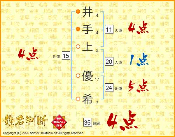 井(4画)手(4画)上(3画) 優(17画)希(7画)