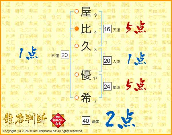 屋(9画)比(4画)久(3画) 優(17画)希(7画)