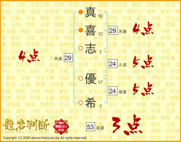 真(10画)喜(12画)志(7画) 優(17画)希(7画)