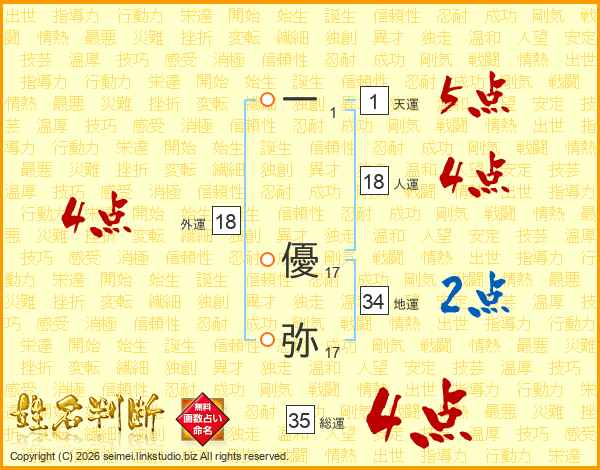 生活面を象徴する運勢です。外部から受ける影響力を表し、結婚運、家庭運や職場、環境への順応性を表します。総運から人運を引いた画数。姓や名が1文字の場合を除く。
