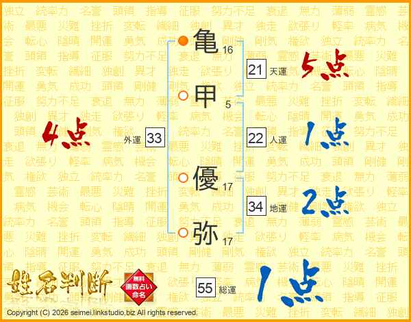 亀(16画)甲(5画) 優(17画)弥(17画)