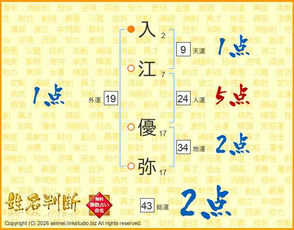 生活面を象徴する運勢です。外部から受ける影響力を表し、結婚運、家庭運や職場、環境への順応性を表します。総運から人運を引いた画数。姓や名が1文字の場合を除く。
