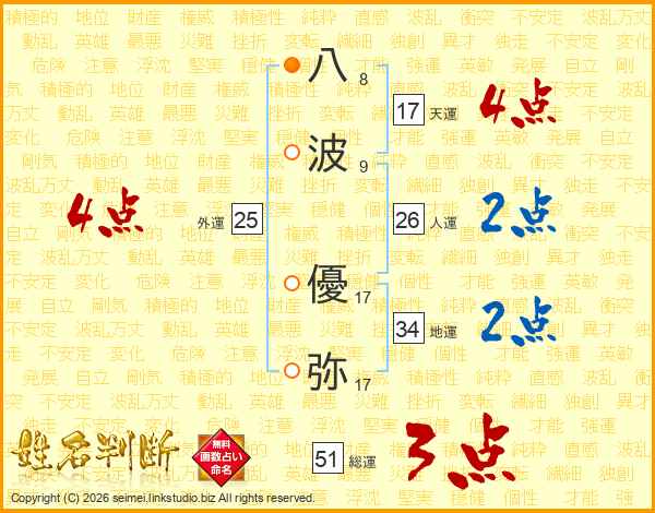 生活面を象徴する運勢です。外部から受ける影響力を表し、結婚運、家庭運や職場、環境への順応性を表します。総運から人運を引いた画数。姓や名が1文字の場合を除く。