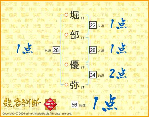 堀(11画)部(11画) 優(17画)弥(17画)