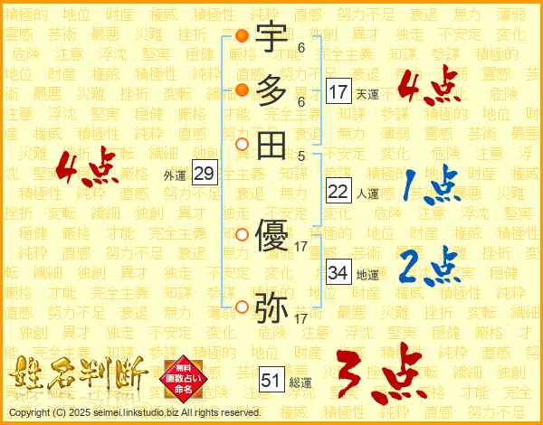 宇(6画)多(6画)田(5画) 優(17画)弥(17画)