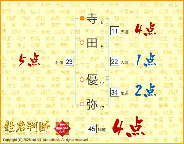 寺(6画)田(5画) 優(17画)弥(17画)