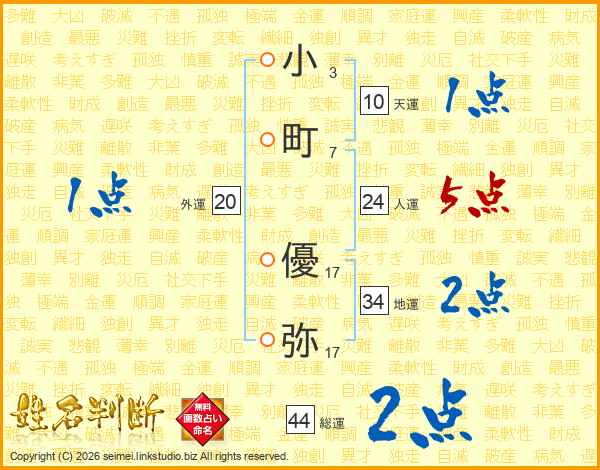 生活面を象徴する運勢です。外部から受ける影響力を表し、結婚運、家庭運や職場、環境への順応性を表します。総運から人運を引いた画数。姓や名が1文字の場合を除く。