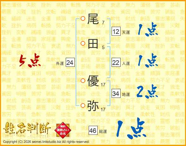 尾(7画)田(5画) 優(17画)弥(17画)