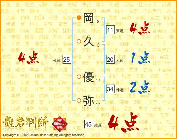 岡(8画)久(3画) 優(17画)弥(17画)