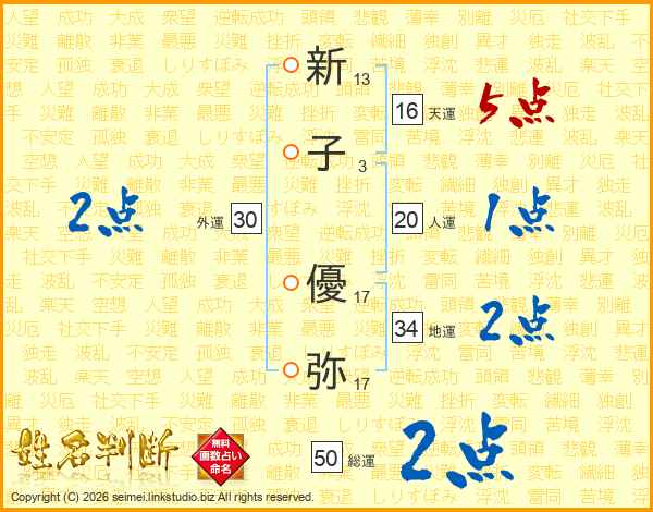 新(13画)子(3画) 優(17画)弥(17画)