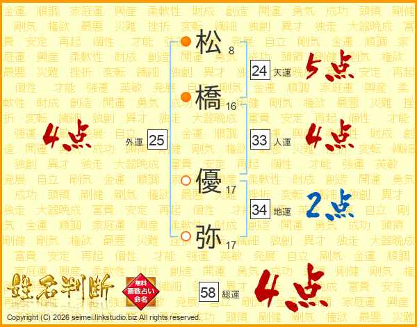 あなたの人生を表す1番重要な運勢です。生涯を通じて影響する総合運となり、主に50歳以降の晩年期に影響を及ぼします。苗字と名前の合計画数。