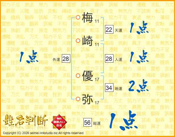 梅(11画)崎(11画) 優(17画)弥(17画)