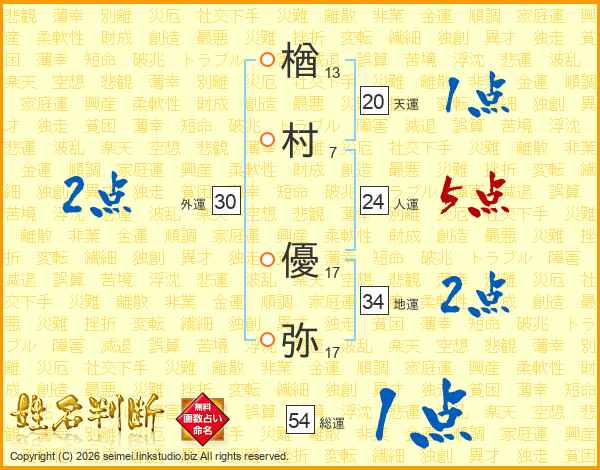 楢(13画)村(7画) 優(17画)弥(17画)