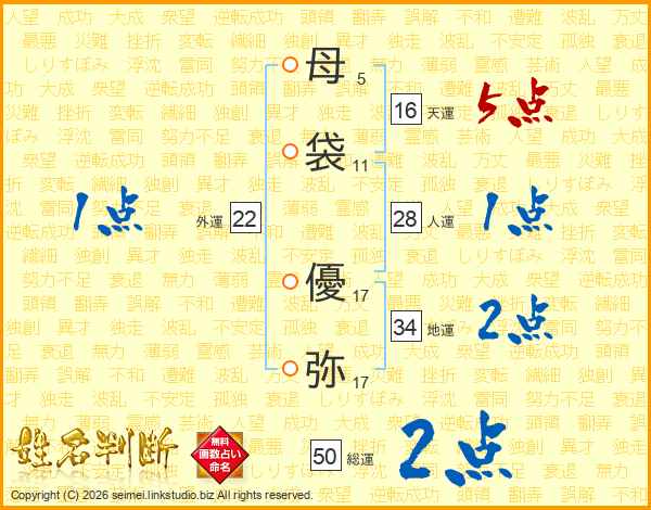 母(5画)袋(11画) 優(17画)弥(17画)