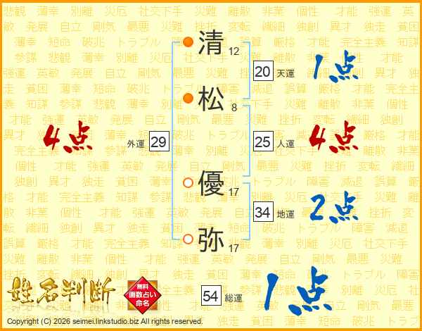 生活面を象徴する運勢です。外部から受ける影響力を表し、結婚運、家庭運や職場、環境への順応性を表します。総運から人運を引いた画数。姓や名が1文字の場合を除く。