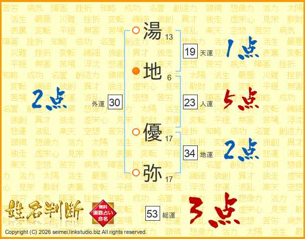 湯(13画)地(6画) 優(17画)弥(17画)