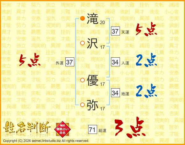 滝(20画)沢(17画) 優(17画)弥(17画)