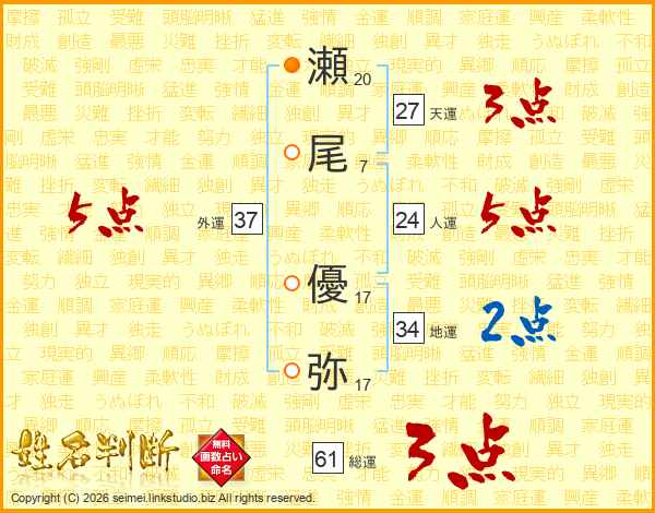 瀬(20画)尾(7画) 優(17画)弥(17画)