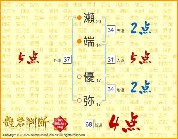 瀬端優弥さんの総運は68画の4点!