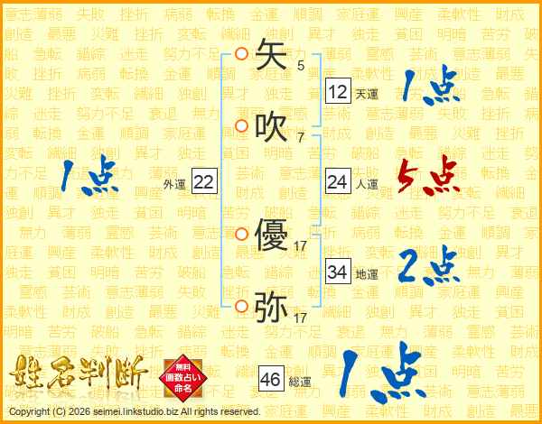 矢(5画)吹(7画) 優(17画)弥(17画)