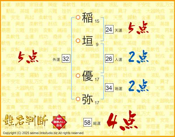稲(15画)垣(9画) 優(17画)弥(17画)