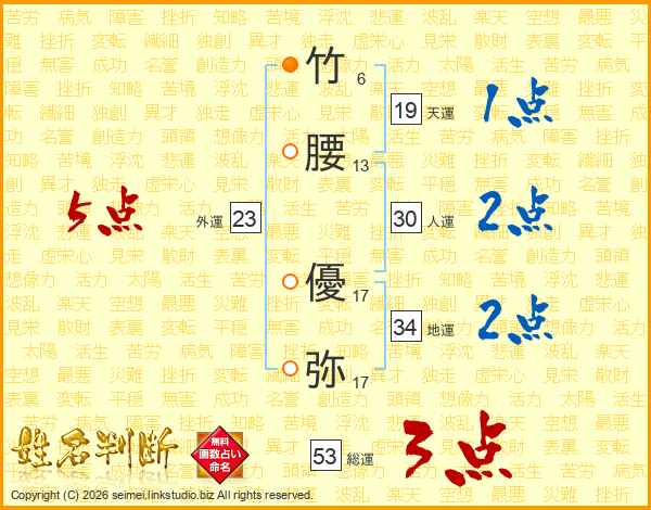 竹(6画)腰(13画) 優(17画)弥(17画)
