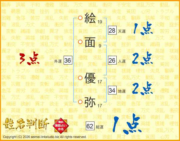 絵(19画)面(9画) 優(17画)弥(17画)