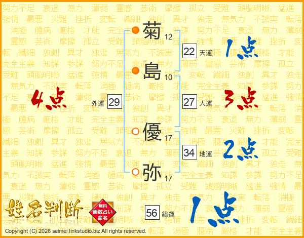 菊(12画)島(10画) 優(17画)弥(17画)