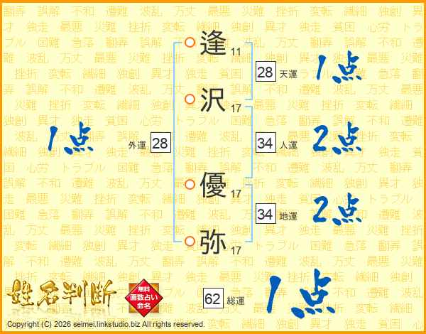 逢沢優弥さんの総運は62画の1点!