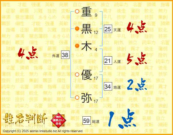 重(9画)黒(12画)木(4画) 優(17画)弥(17画)