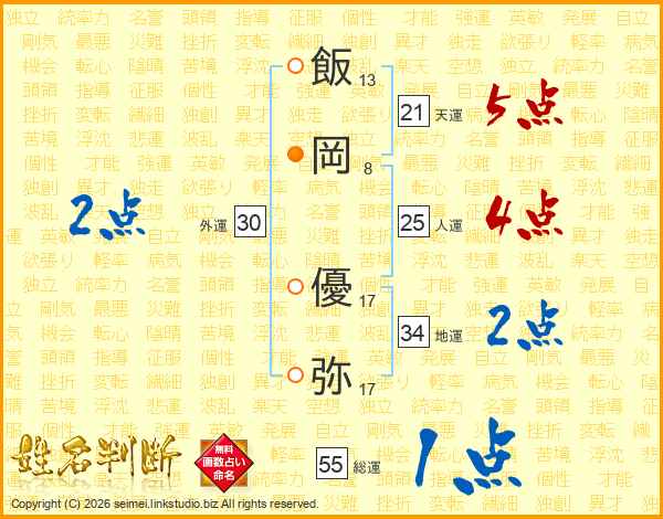 飯(13画)岡(8画) 優(17画)弥(17画)