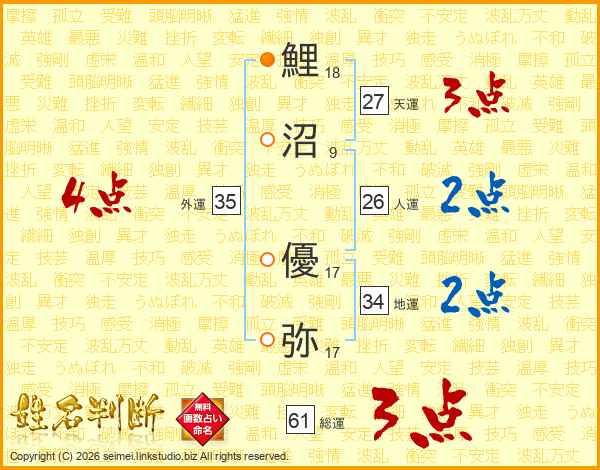 鯉沼優弥さんの外運は35画の4点!