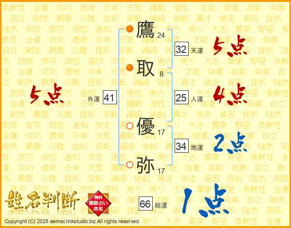 鷹(24画)取(8画) 優(17画)弥(17画)