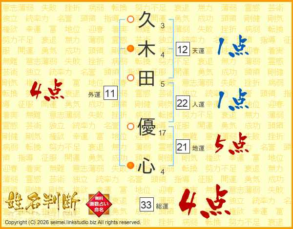 久(3画)木(4画)田(5画) 優(17画)心(4画)