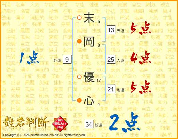 末(5画)岡(8画) 優(17画)心(4画)