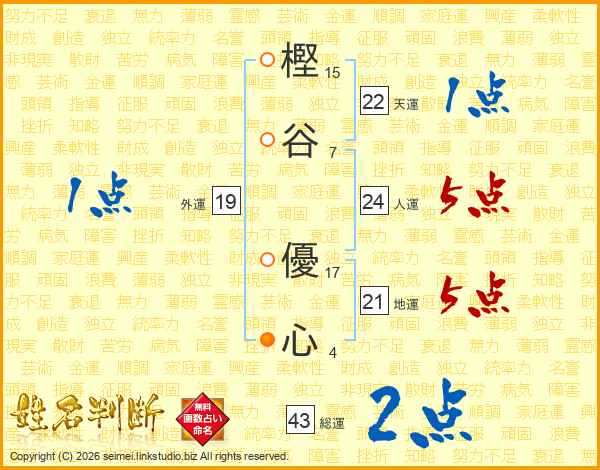 樫谷優心さんの総運は43画の2点!
