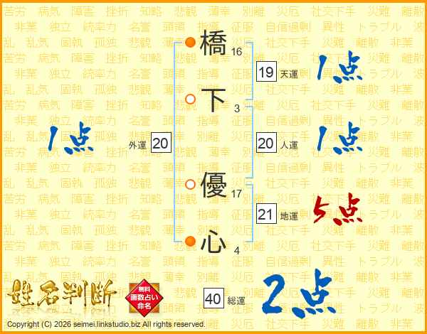 生活面を象徴する運勢です。外部から受ける影響力を表し、結婚運、家庭運や職場、環境への順応性を表します。総運から人運を引いた画数。姓や名が1文字の場合を除く。