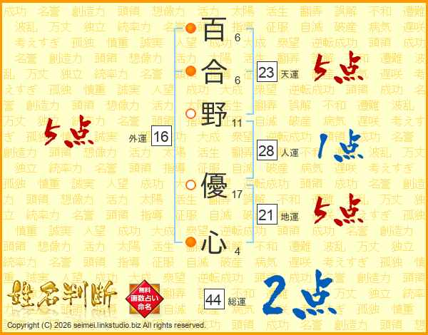 百合野優心さんの天運は23画の5点!